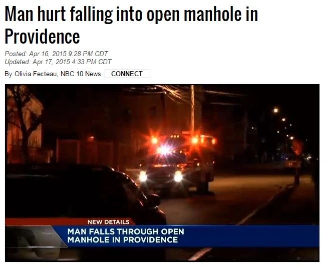 April 6, 2015 – Channel 10 NBC News in Providence, RI reports that a jogger falls into an open manhole and was “seriously hurt.”