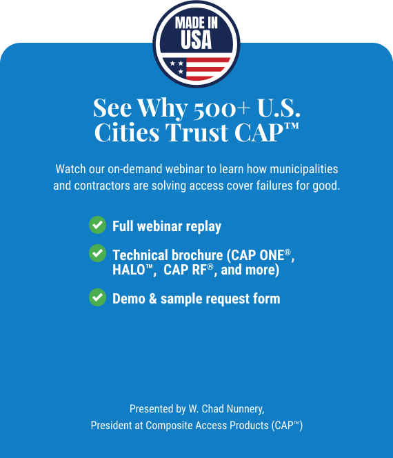 CAP™’s composite cover technology was selected for a PBS educational broadcast. Hosted by Dennis Quaid, this high-quality production showcases the benefits with interviews from Public Works leaders from Fulton County, GA and McAllen, TX including how CAP™s can eliminate a leading cause of water pollution. Click “Play” to see the video.